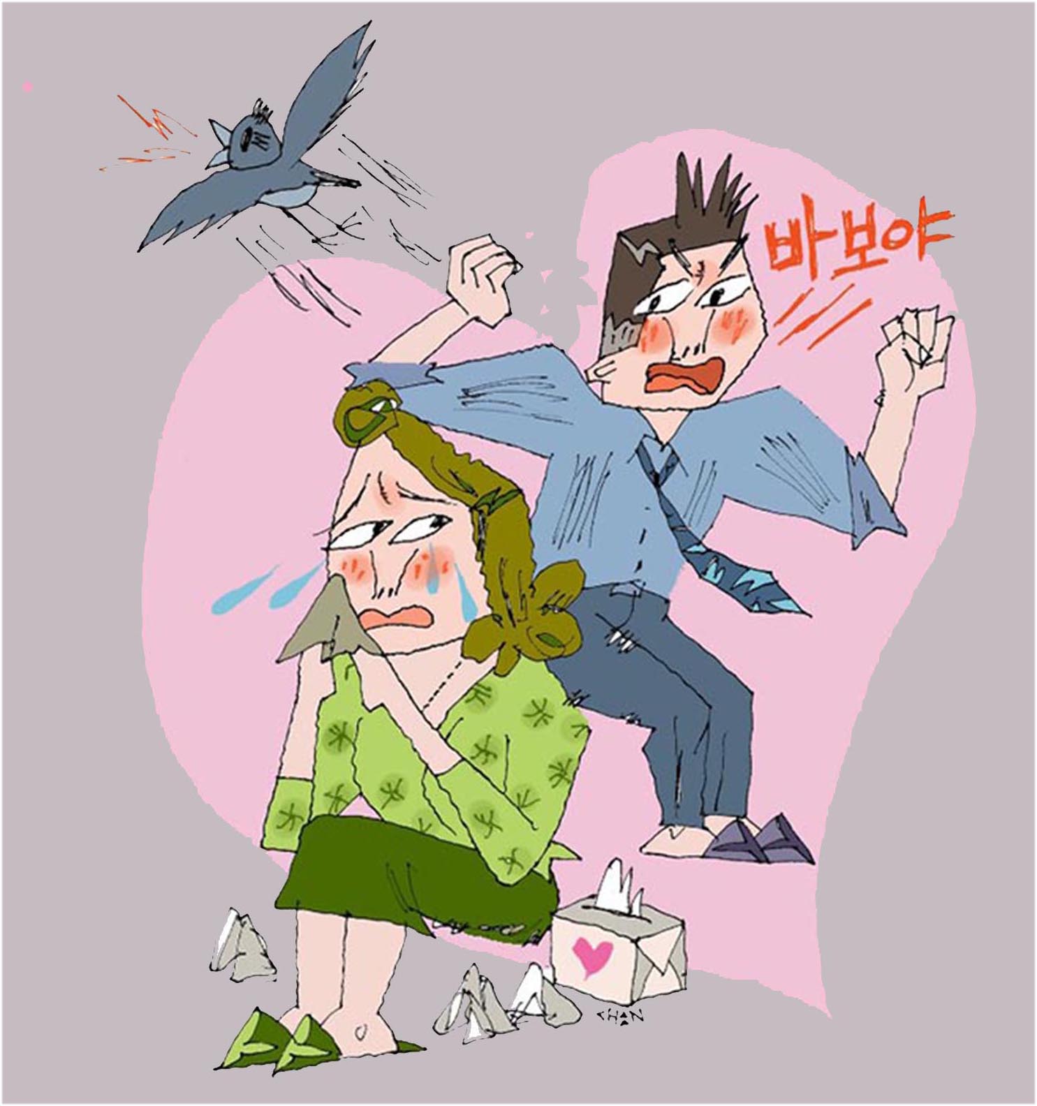 뒤돌아 앉아 훌쩍거리며 울고 있는 아내에게