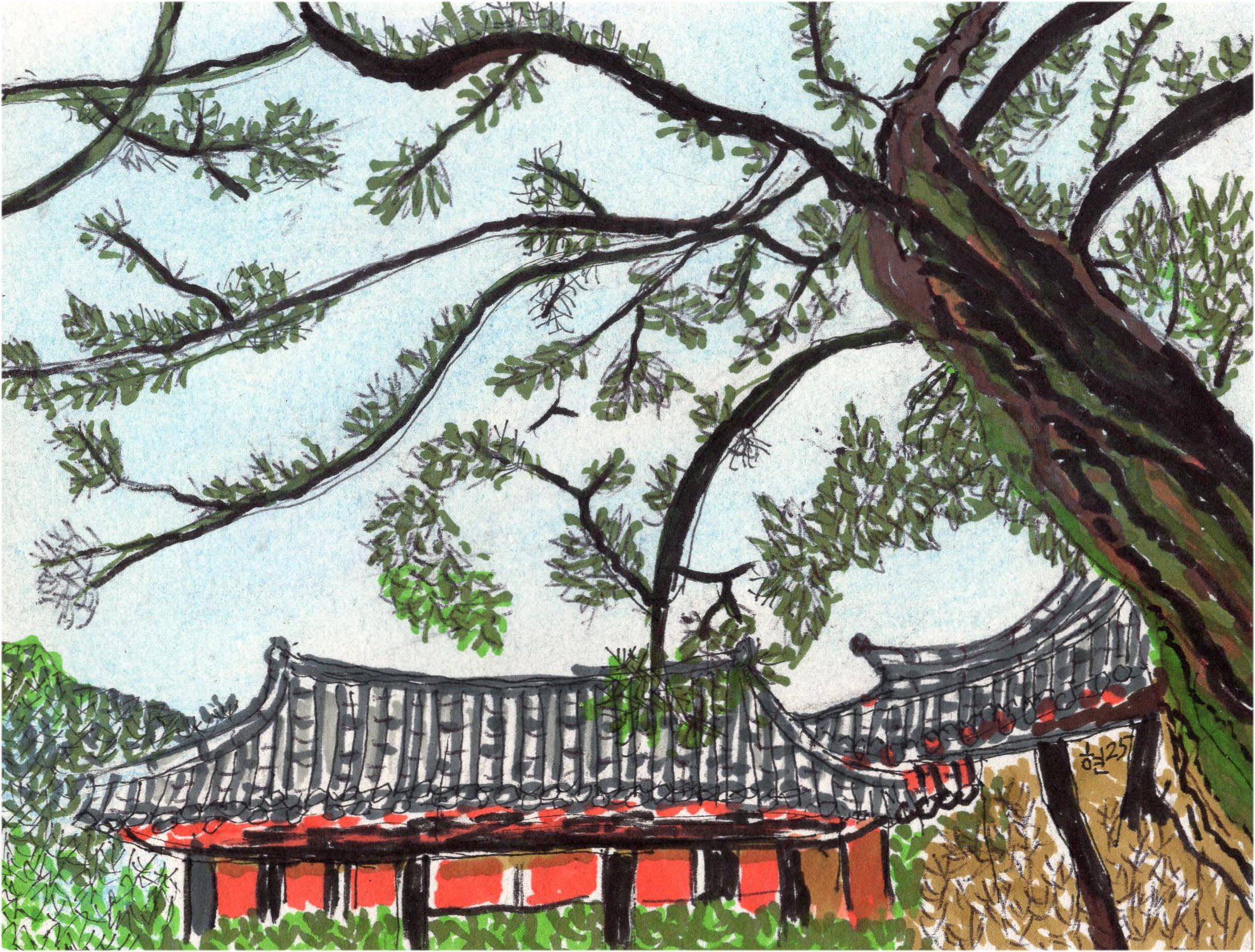 하늘과 나무와 기와지붕도 어느사이 순식간에 그려졌다.